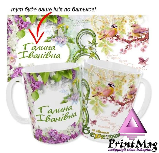 Чудові квіти на горнятах для чарівних жінок. Горнята улюбленим вчителям зі святом весни з вітанням та побажанням.