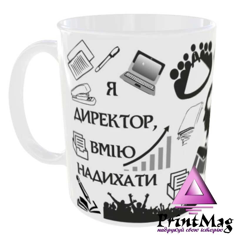 Чашка з написами «Я директор, вмію надихати." Напис на чашці з обох боків.