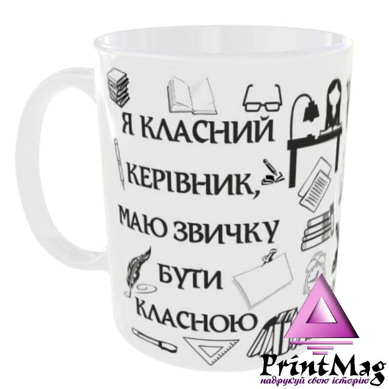 Чашка з написами «Я класний керівник, маю звичку бути класною.» Напис на чашці з обох боків.