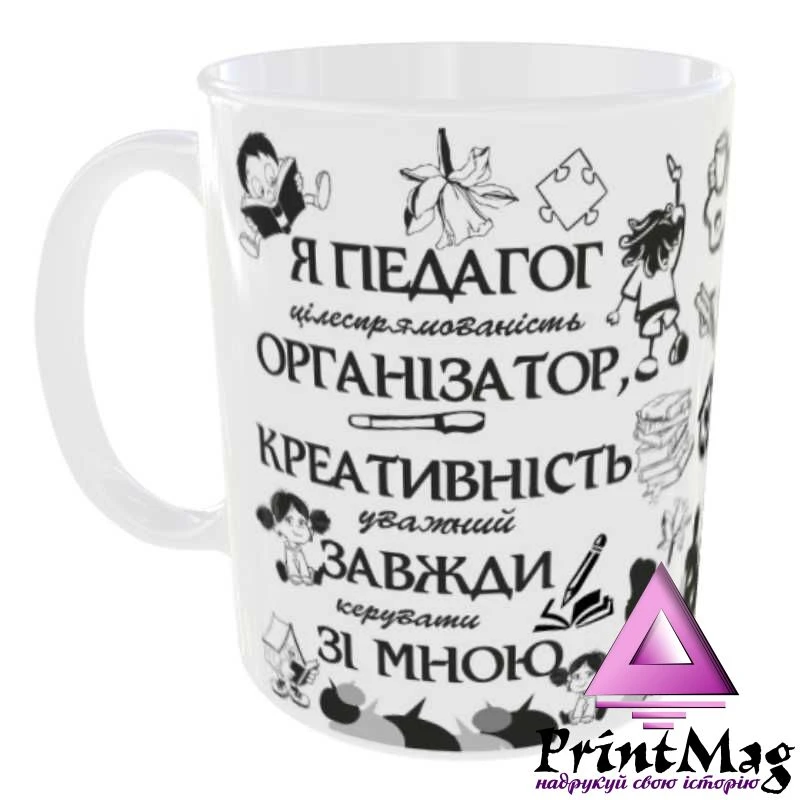 Чашка з написами «Я педагог організатор, креативність завжди зі мною.» Напис на чашці з обох боків.
