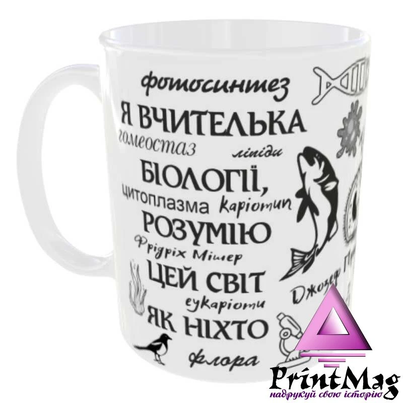 Чашка з написами «Я вчителька біології, розумію цей світ як ніхто.» Напис на чашці з обох боків.