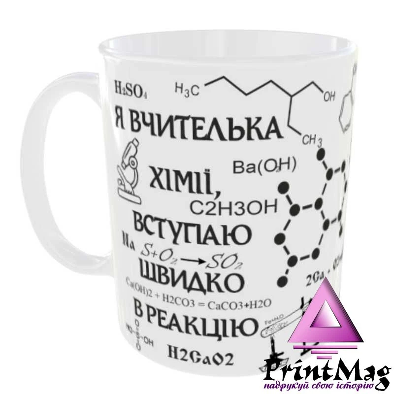 Чашка з принтом та написом «Я вчителька хімії, вступаю швидко в реакцію». Для вчительки хімії. Напис на чашці з обох боків.