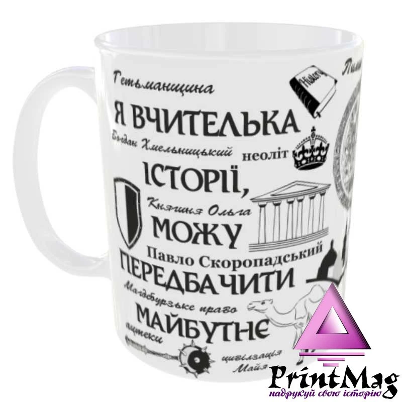 Чашка з написами «Я вчителька історії, можу передбачити майбутнє.» Напис на чашці з обох боків.
