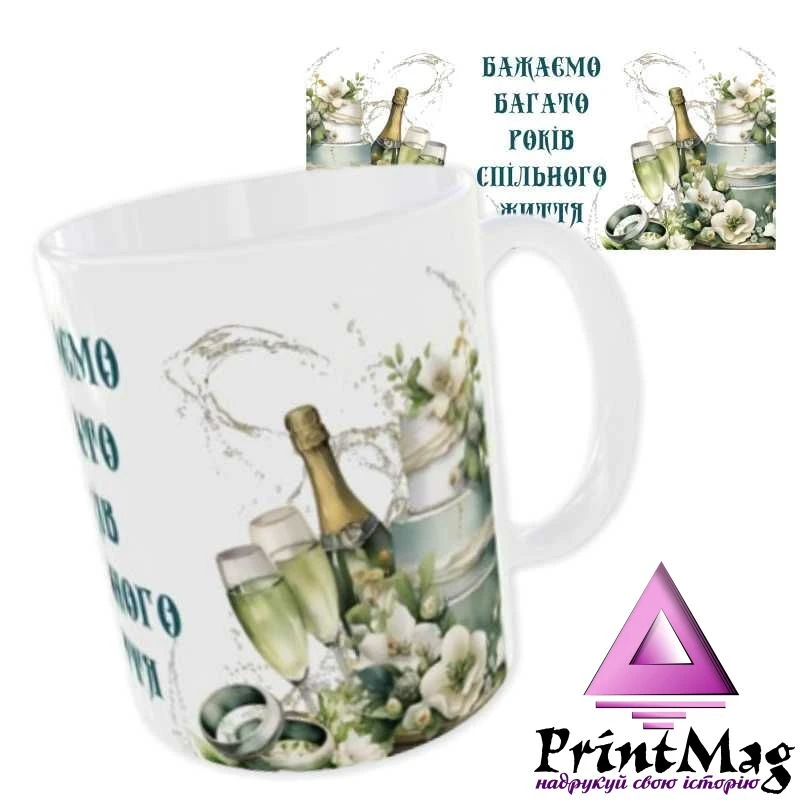 Чашка «Бажаємо багато років спільного життя». Принт з обох боків. За бажанням можна добавити Ваше фото з протележного боку. Подарунок на річницю. Чашка з тематичним принтом - чудовий подарунок на річницю весілля, подарунок на ситцеве весілля! Хочете здивувати близьку людину? Замовте чашку з оригінальним і пам'ятним написом та з картинкою. Якщо цікавить ОПТ – ТЕЛЕФОНУЙТЕ.