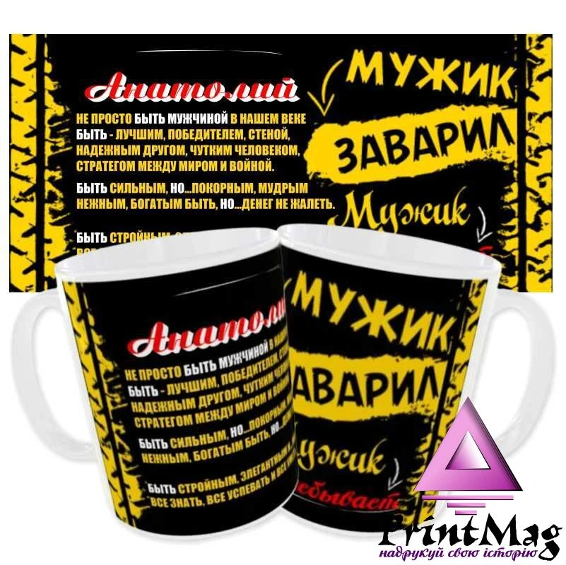 Іменна чашка Анатолій “Чоловік заварив чоловік розхльобує”. Чашка з оригінальним принтом - чудовий подарунок до будь-якого свята або просто так.