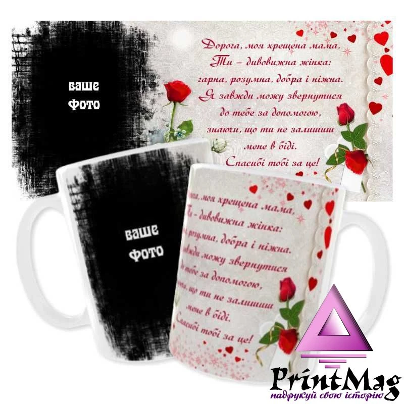 Чашка «Дорога моя Хрещена Мама». З протележного боку можна добавити Ваше фото. Кружки з принтом вибирають ті, хто хоче зробити незвичайний, однозначно корисний подарунок, якому зрадіють рідні та друзі, колеги, і навіть корпоративні клієнти. Хочете здивувати близьку людину? Замовте чашку з оригінальним і пам'ятним написом або картинкою. Раді співпраці зі школами та дитячими садами! Якщо цікавить ОПТ – ТЕЛЕФОНУЙТЕ.