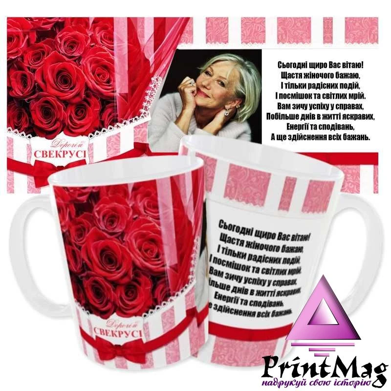 Чашка з принтом «Дорогій свекрусі» з протележного боку можна добавити Ваше фото - універсальний подарунок, до будь-якого свята або просто так. Друк на чашках вибирають ті, хто хоче зробити незвичайний, однозначно корисний подарунок, якому зрадіють рідні та друзі, колеги, і навіть корпоративні клієнти. Хочете здивувати близьку людину? Замовте оригінальний або пам'ятний напис, картинку, а краще надрукуйте фото на кружці того, кому призначений сюрприз.
