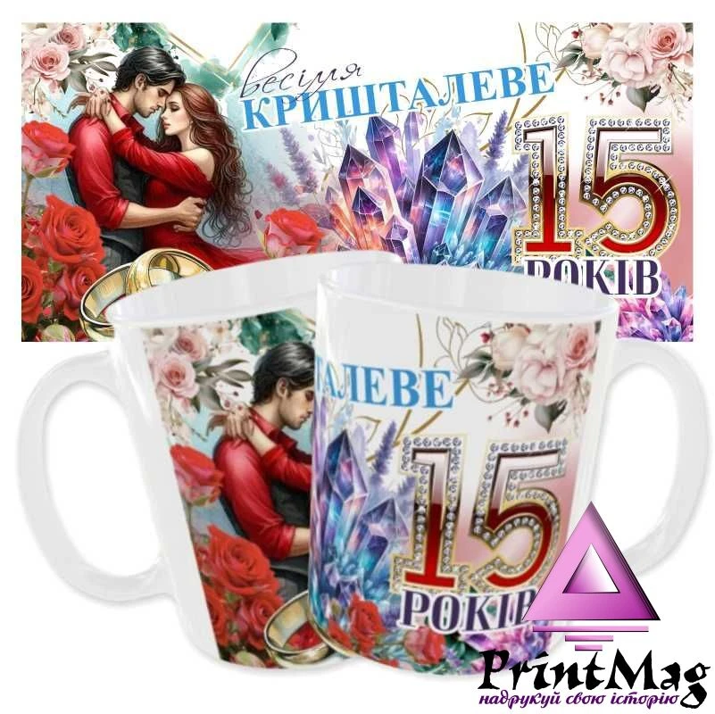 Чашка «Кришталеве весілля. 15 років». Подарунок на річницю. Чашка з тематичним принтом - чудовий подарунок на річницю весілля, подарунок на ситцеве весілля! Хочете здивувати близьку людину? Замовте чашку з оригінальним і пам'ятним написом та з картинкою. Якщо цікавить ОПТ – ТЕЛЕФОНУЙТЕ.
