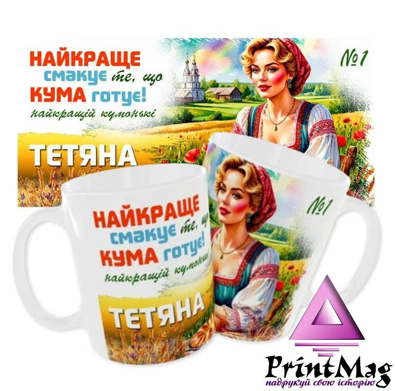 Чашка «Найкраще смакує те, що Кума готує» - універсальний подарунок, до будь-якого свята або просто так.