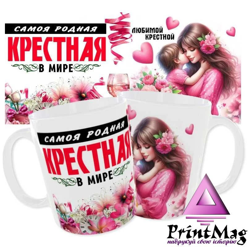 Чашка з принтом «Найрідніша хрещена в світі». Корисний сувенір до будь-якого свята з символічним малюнком та написом миттєво підніме настрій і порадує свого власника.