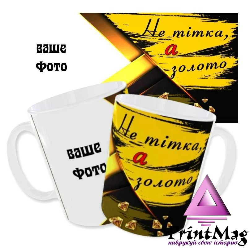 Чашка «Не тітка, а золото». З протележного боку можна добавити Ваше фото. Кружки з принтом вибирають ті, хто хоче зробити незвичайний, однозначно корисний подарунок, якому зрадіють рідні та друзі, колеги, і навіть корпоративні клієнти. Хочете здивувати близьку людину? Замовте чашку з оригінальним і пам'ятним написом або картинкою. Раді співпраці зі школами та дитячими садами! Якщо цікавить ОПТ – ТЕЛЕФОНУЙТЕ.