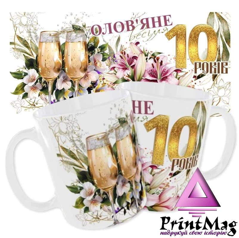 Чашка «Олов’яне весілля. 10 років». Подарунок на річницю. Чашка з тематичним принтом - чудовий подарунок на річницю весілля, подарунок на ситцеве весілля! Хочете здивувати близьку людину? Замовте чашку з оригінальним і пам'ятним написом та з картинкою. Якщо цікавить ОПТ – ТЕЛЕФОНУЙТЕ.