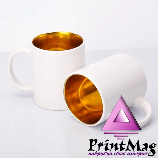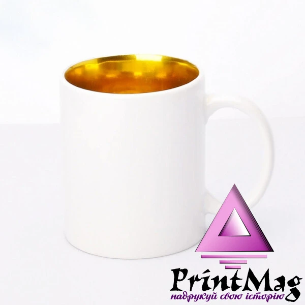 Чашка для сублімації керамічна біла з металізованим глянсовим покриттям усередині. Чашка покрита сублімаційним лаком, що забезпечує ідеальне нанесення картинки за допомогою сублімаційного друку.