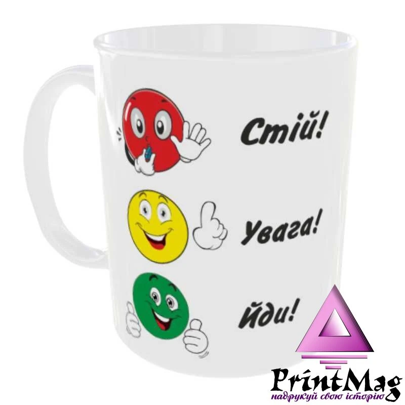 Чашка з принтом «Світлофор». Розглядаючи міміку і жести різних «обличь» світлофора, дитина розуміє і запам'ятовує, що «говорить» їй кожен сигнал, і ненав'язливо знайомиться з правилами безпечного руху на дорозі.