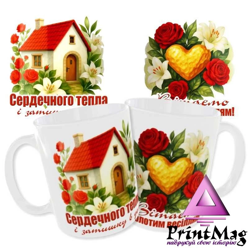 Чашка «Вітаємо із золотим весіллям. Сердечного тепла і затишку в домі». Принт з обох боків. Подарунок на річницю. Чашка з тематичним принтом - чудовий подарунок на річницю весілля, подарунок на ситцеве весілля! Хочете здивувати близьку людину? Замовте чашку з оригінальним і пам'ятним написом та з картинкою. Якщо цікавить ОПТ – ТЕЛЕФОНУЙТЕ.