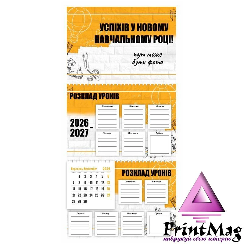 Календар включає відривний 1 блок на навчальний шкільний рік (з вересня 2026р по травень 2027р), шапку (верхній постер) з люверсом. Друк повнокольоровий. Основа під календарним блоком – крейдований папір щільністю 300 г. Блоки скріплені між собою пружиною. В комплекті до календаря є віконце червоного кольору на прозорій стрічці.