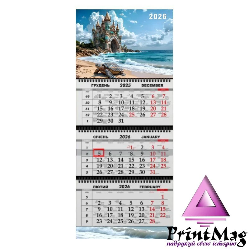 Календар включає 3 блоки по 12 аркушів, 1 рекламне поле і шапку (верхній постер) з люверсом. Друк повнокольоровий. Основа під календарними блоками – крейдований папір щільністю 300 г. Відривні листи датовані, з зазначенням всіх державних свят, включаючи професійні та релігійні. Блоки скріплені між собою пружиною. В комплекті до календаря є віконце червоного кольору на прозорій стрічці.