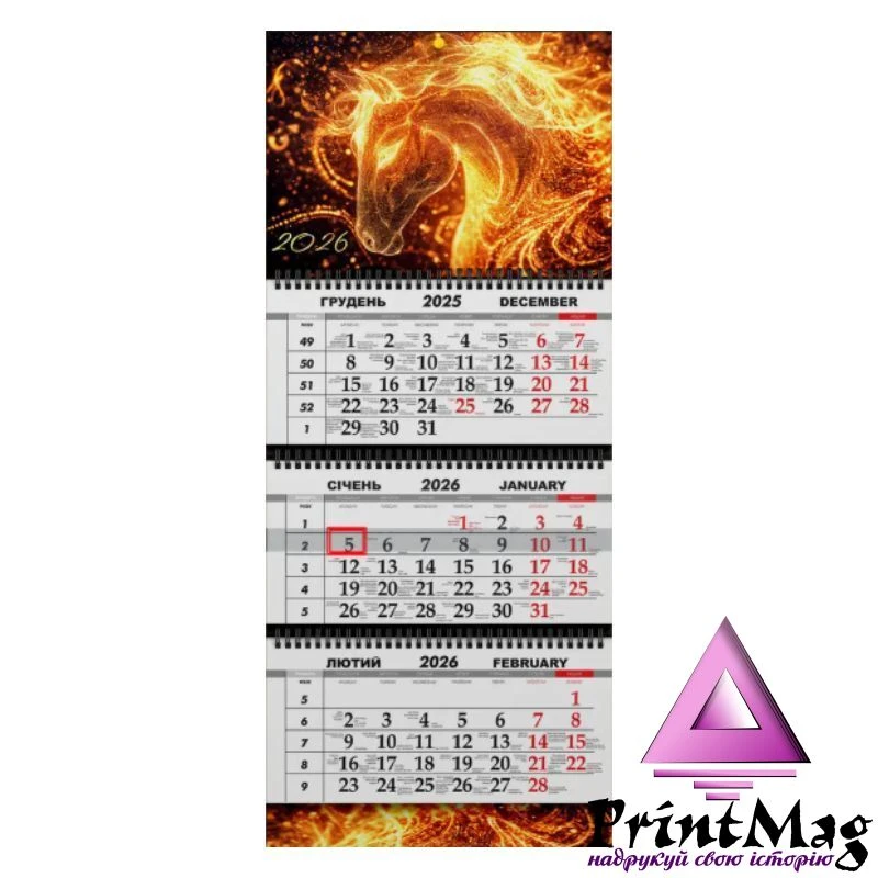 Календар включає 3 блоки по 12 аркушів, 1 рекламне поле і шапку (верхній постер) з люверсом. Друк повнокольоровий. Основа під календарними блоками – крейдований папір щільністю 300 г. Відривні листи датовані, з зазначенням всіх державних свят, включаючи професійні та релігійні. Блоки скріплені між собою пружиною. В комплекті до календаря є віконце червоного кольору на прозорій стрічці.