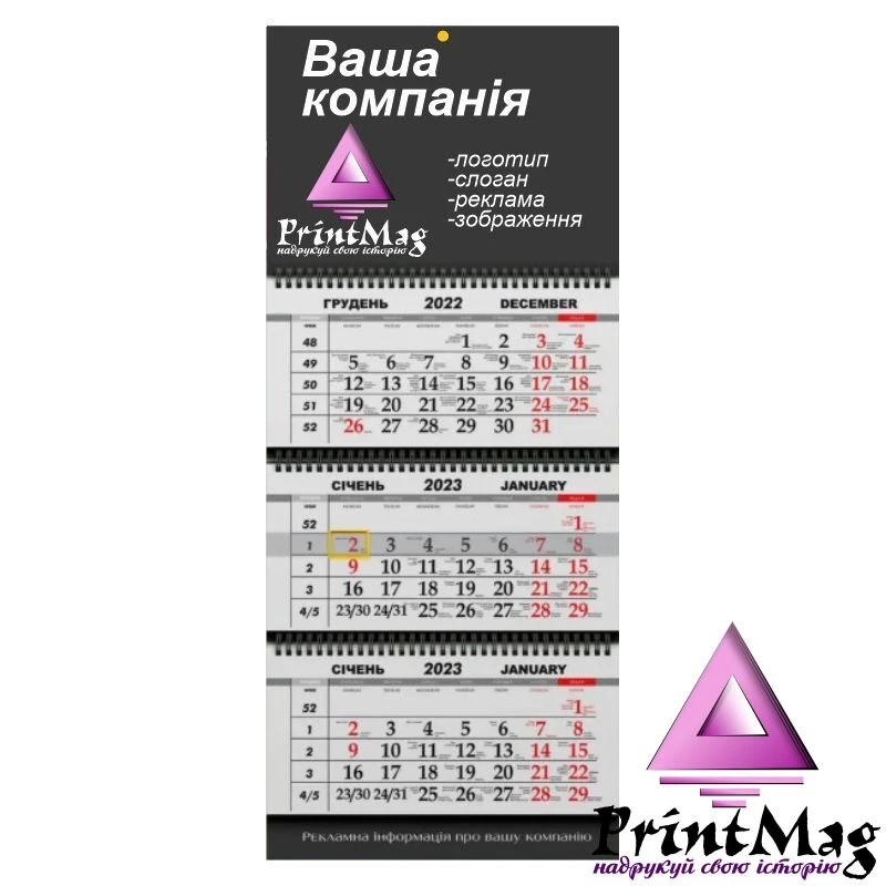 Квартальний календар – один із самих популярних новорічних подарунків для своїх партнерів та потенційних клієнтів. Він зручний у використанні, не займає багато місця та може бути чудовим доповненням інтер’єру офісу. Квартальний календар допоможе у роботі як бухгалтеру, так і керівнику підприємства. Це чудовий спосіб нагадувати про себе цілий рік!